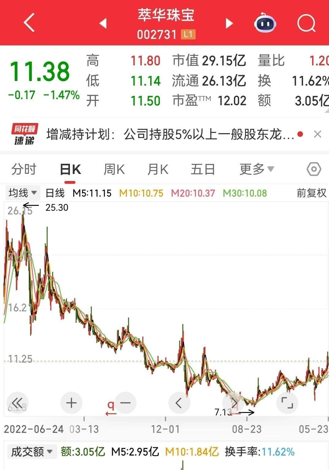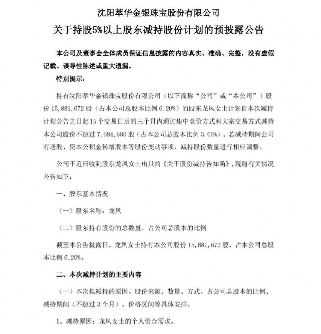 萃华珠宝(002731):股东龙凤女士一口气减持768万股(占3%),按收盘价11.38元计算套现8745万元。 这是她持股6.2%后的首次减持,股份来自协议转让,公告一出股价直接跌停。