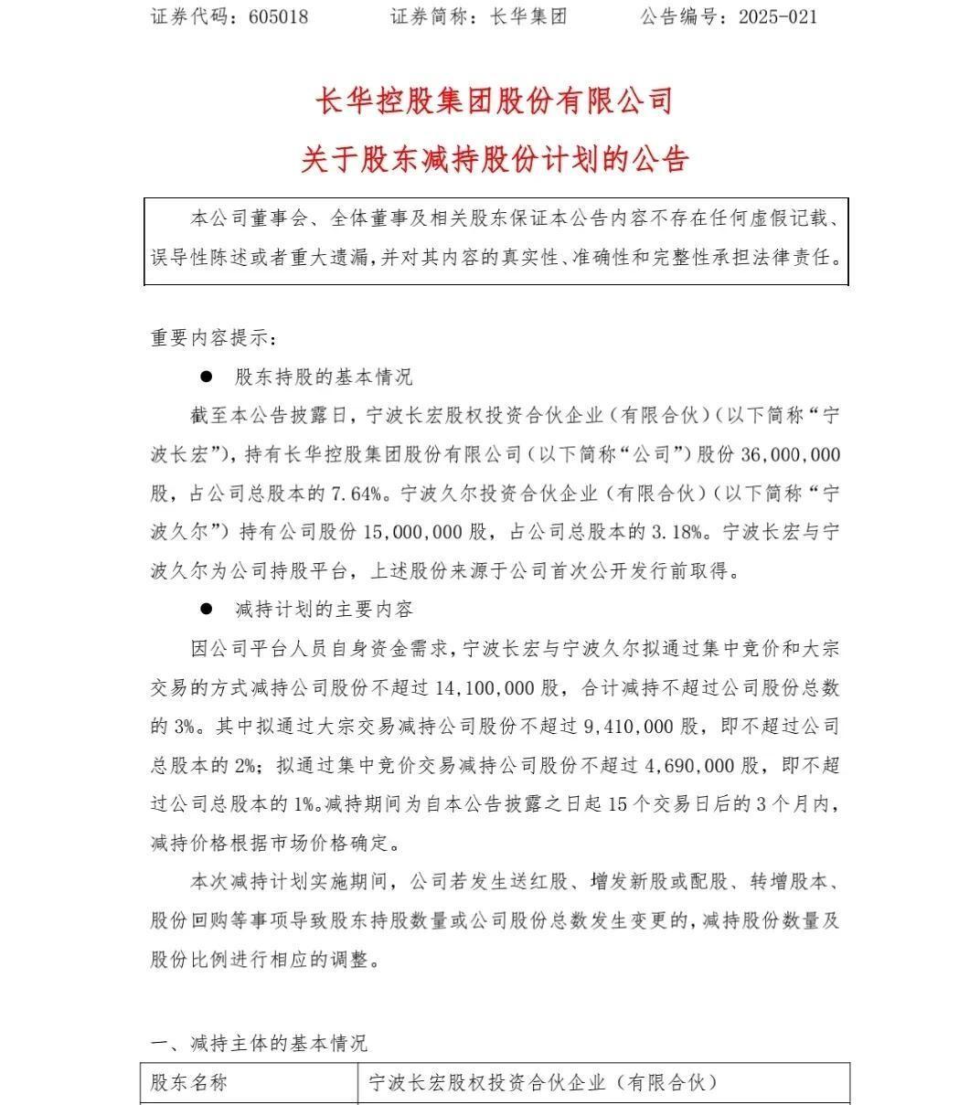 2. 长华集团(605018):宁波长宏和久尔投资两大股东联手减持1410万股(占3%),其中大宗交易占2%,接盘方是量化私募,折价率高达9.8%。 按11.47元股价计算,套现总额1.62亿元,创下5月单日减持金额最高纪录。